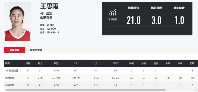 此役王思雨全場比賽替補(bǔ)20分鐘,10中7,三分3中1,罰球7中6,拿到21分3籃板1助攻2搶斷僅1失誤,命中率70%,她的個人表現(xiàn)比多位年輕核心更出色。
