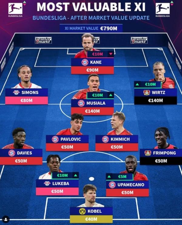 12月20日訊 《轉(zhuǎn)會市場》今日更新了德甲球員身價,并列出了一套德甲最貴陣,拜仁6將在列,萊比錫、藥廠各2人。