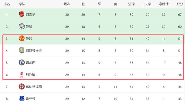 由于曼聯(lián)輸球,英超爭四格局也更加混亂了。截至目前,曼聯(lián)、維拉、切爾西和利物浦這4支爭四球隊,本輪的比賽都已經(jīng)結(jié)束,由于切爾西在客場4-1大勝維拉,因此他們已經(jīng)反超利物浦,排名回到第五位,而曼聯(lián)雖然繼續(xù)排名第三,但是他們只領(lǐng)先第六的利物浦3分,爭四形勢隨時將發(fā)生逆轉(zhuǎn)。
