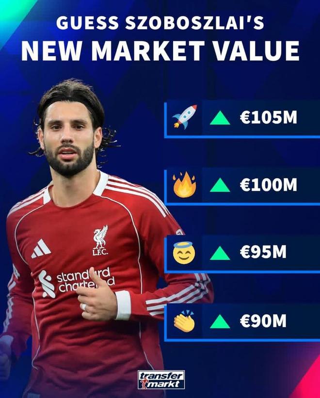 在德轉(zhuǎn)給出的4個選項中,索博斯洛伊身價最高漲至1.05億歐元,其次是漲至1億歐元、9500萬歐元以及9000萬歐元。