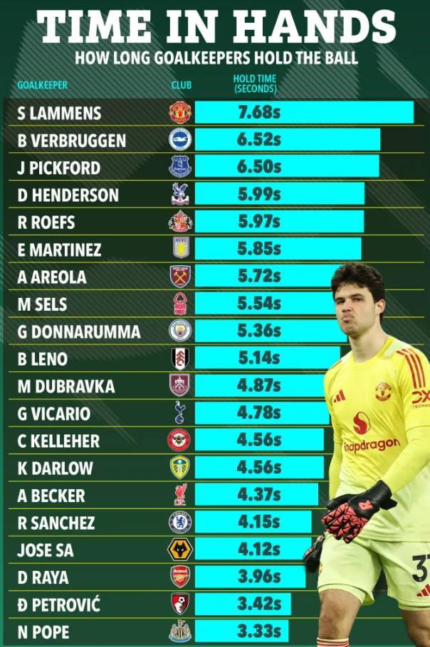 本賽季,英超采用了新規(guī)則,門將被禁止雙手持球超過8秒鐘,否則會(huì)判給對(duì)手角球,而根據(jù)統(tǒng)計(jì),拉門斯的平均持球時(shí)間比聯(lián)賽中任何其他守門員都要長,但仍在8秒以內(nèi)——他每次撿球或接球時(shí)平均持球時(shí)間為7.68秒,僅比限制少0.32秒。